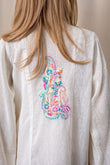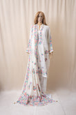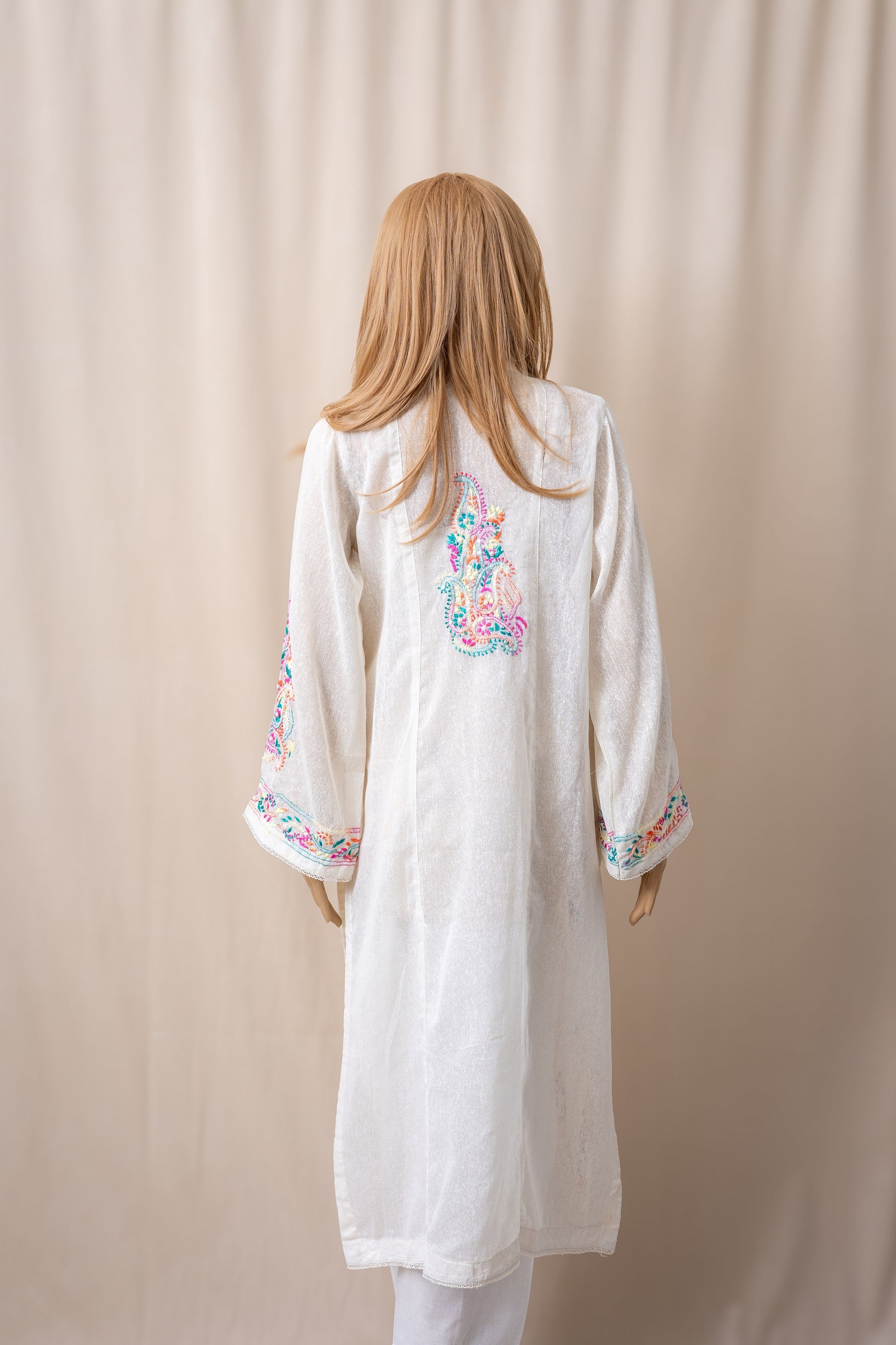 Egg white pure karandi net shirt and dupatta with multi colored embroidery.