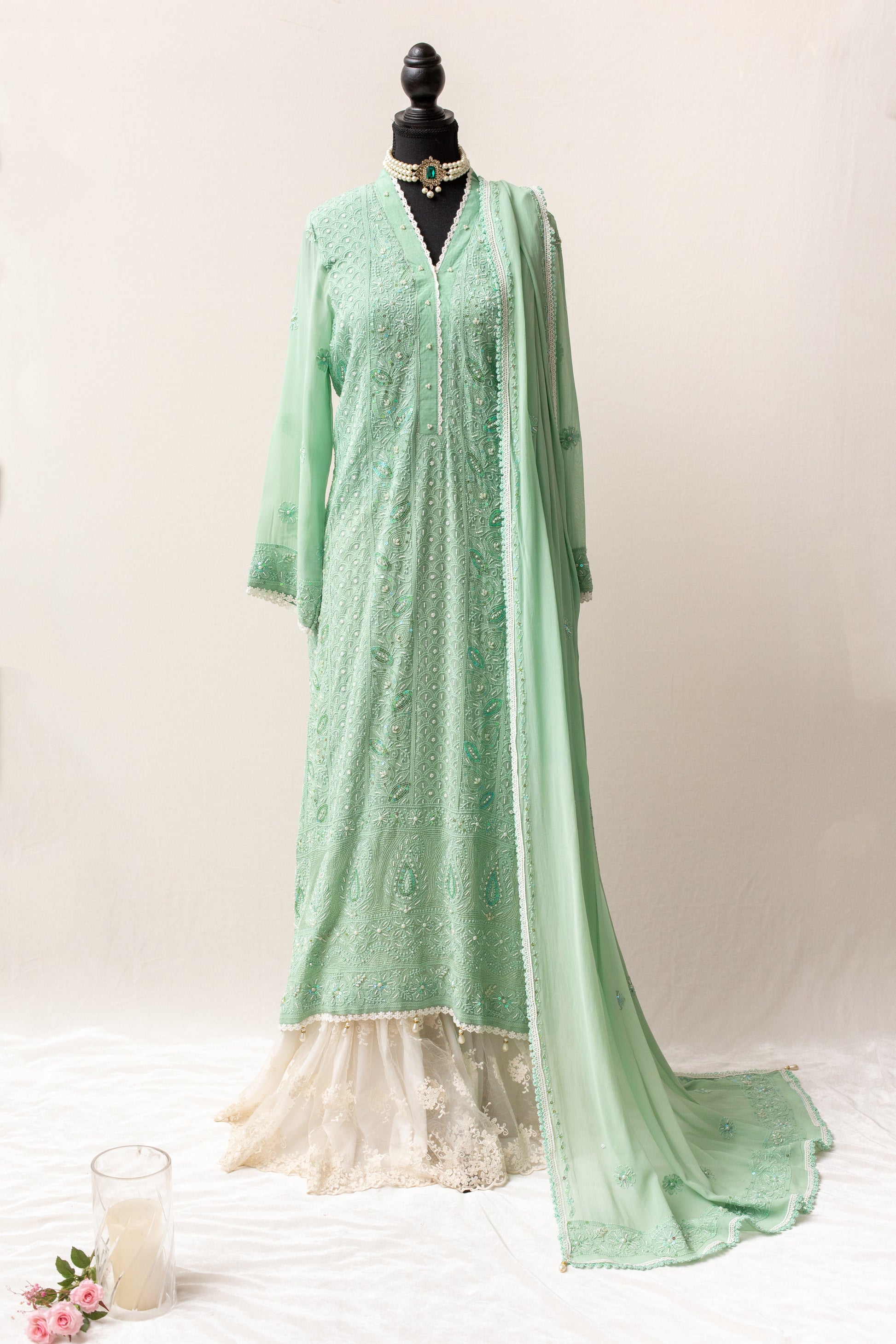Pastel green chikankari viscose shirt with raw silk trouser and dupatta
