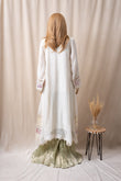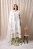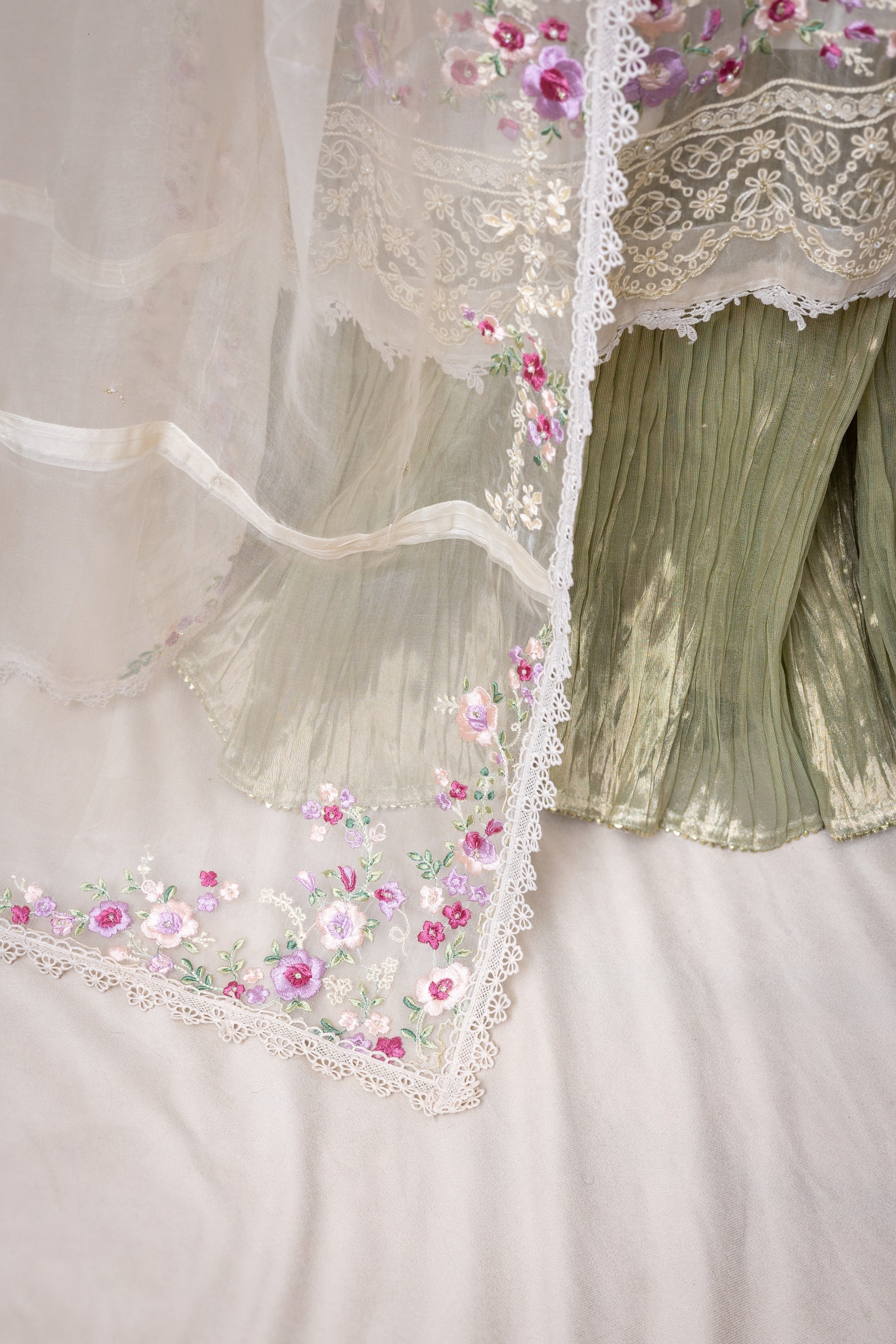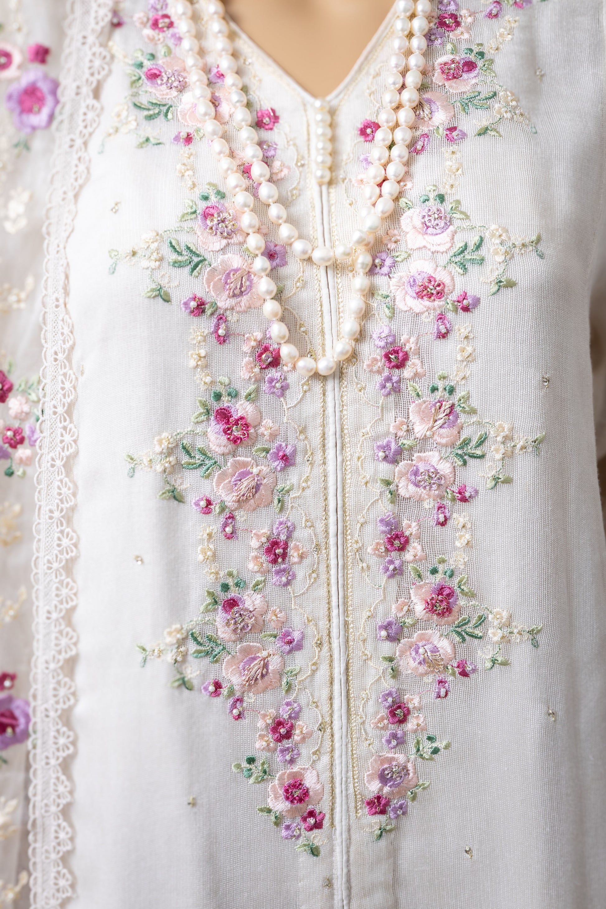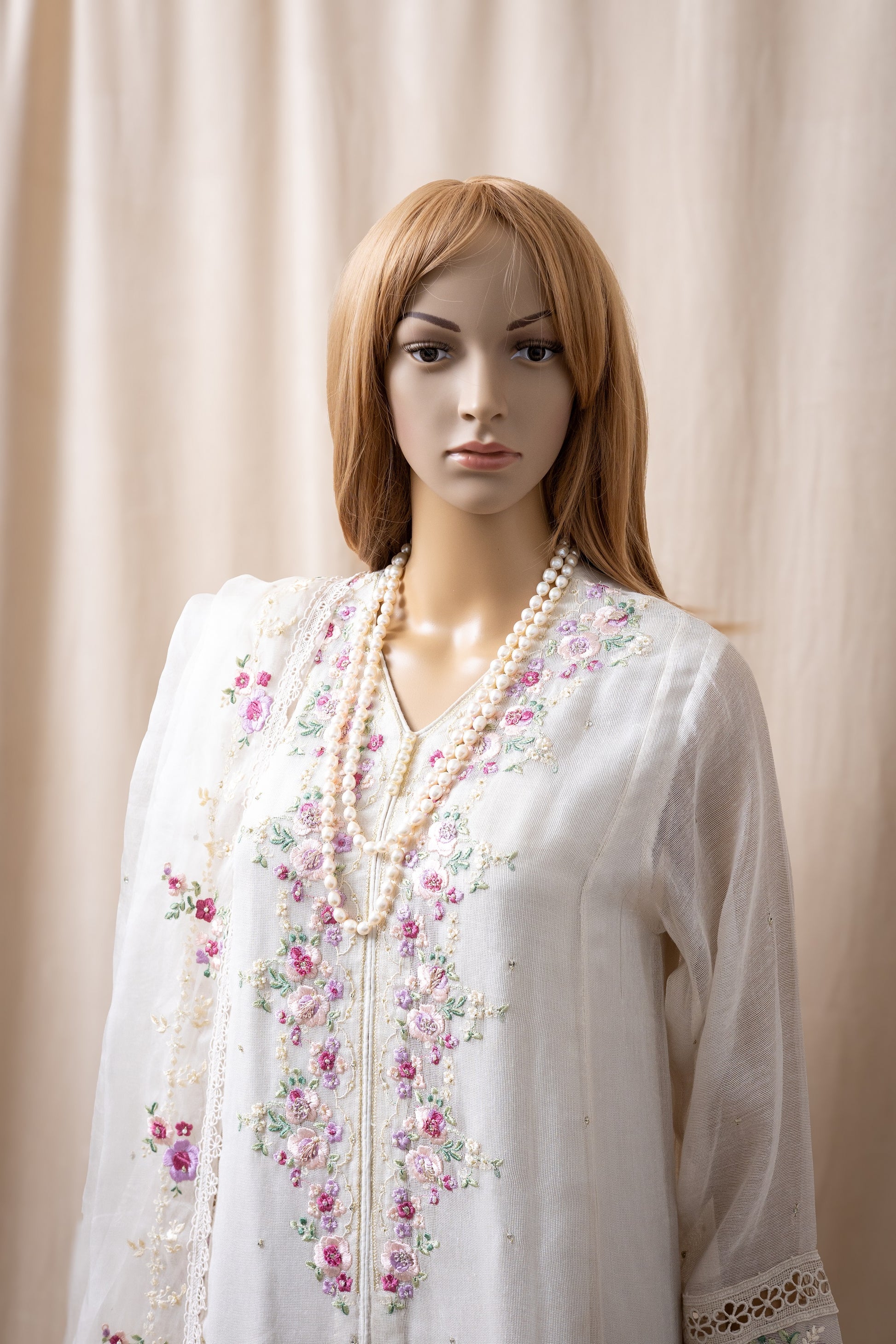 White net A-line frock with pink and purple floral embroidery, pure organza dupatta, and raw silk trouser.