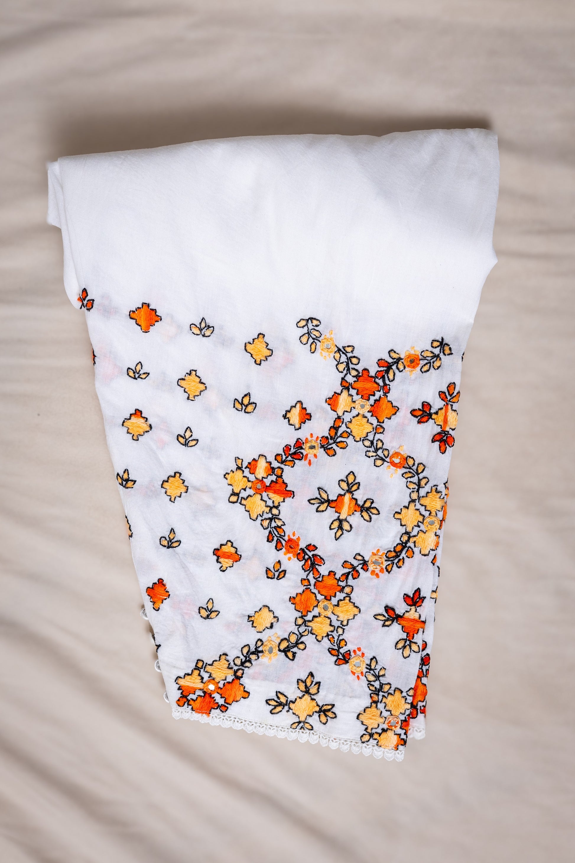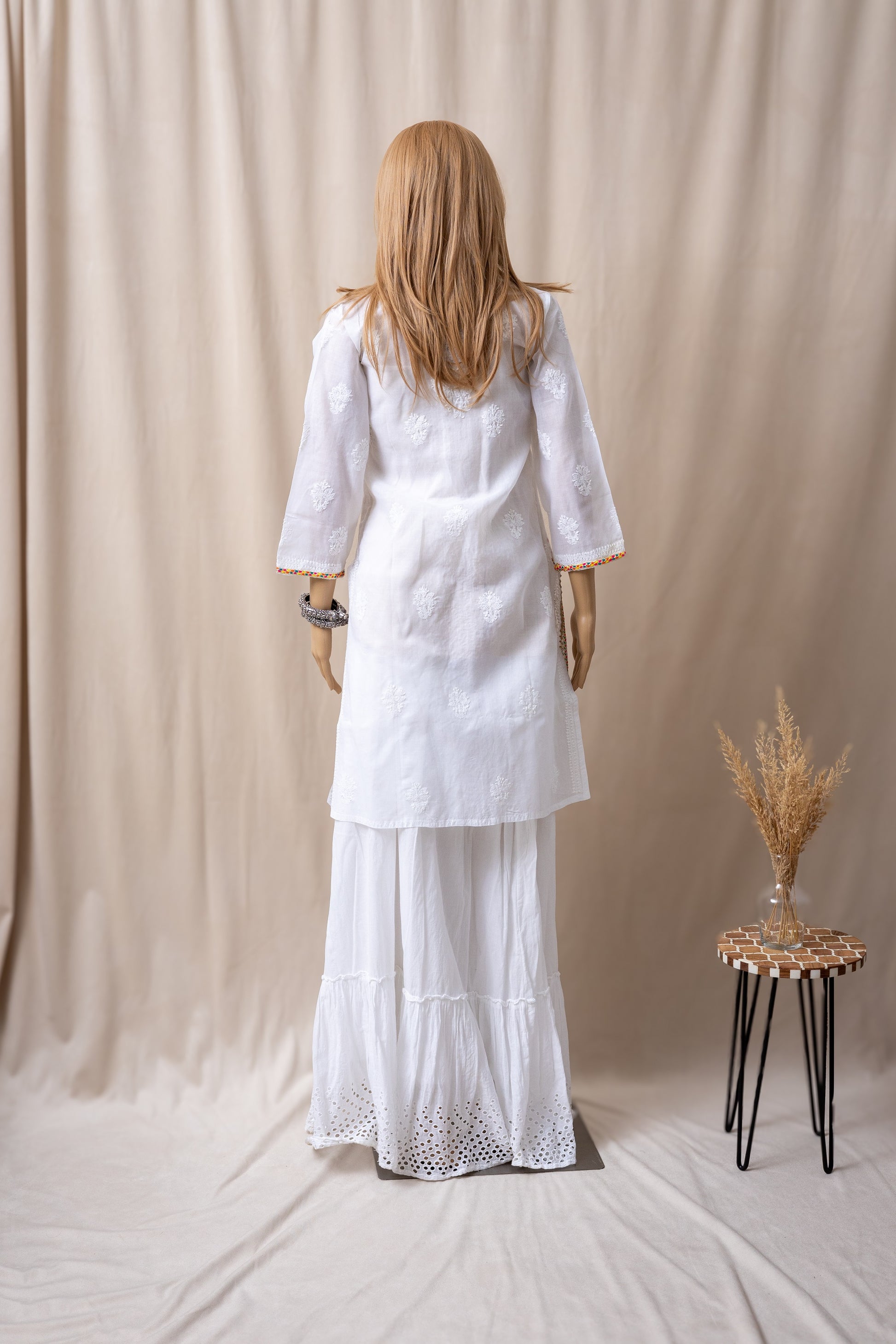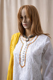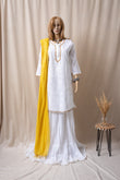White lucknowi chikan kari kurta with embroided shalwar and yellow dupatta.