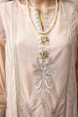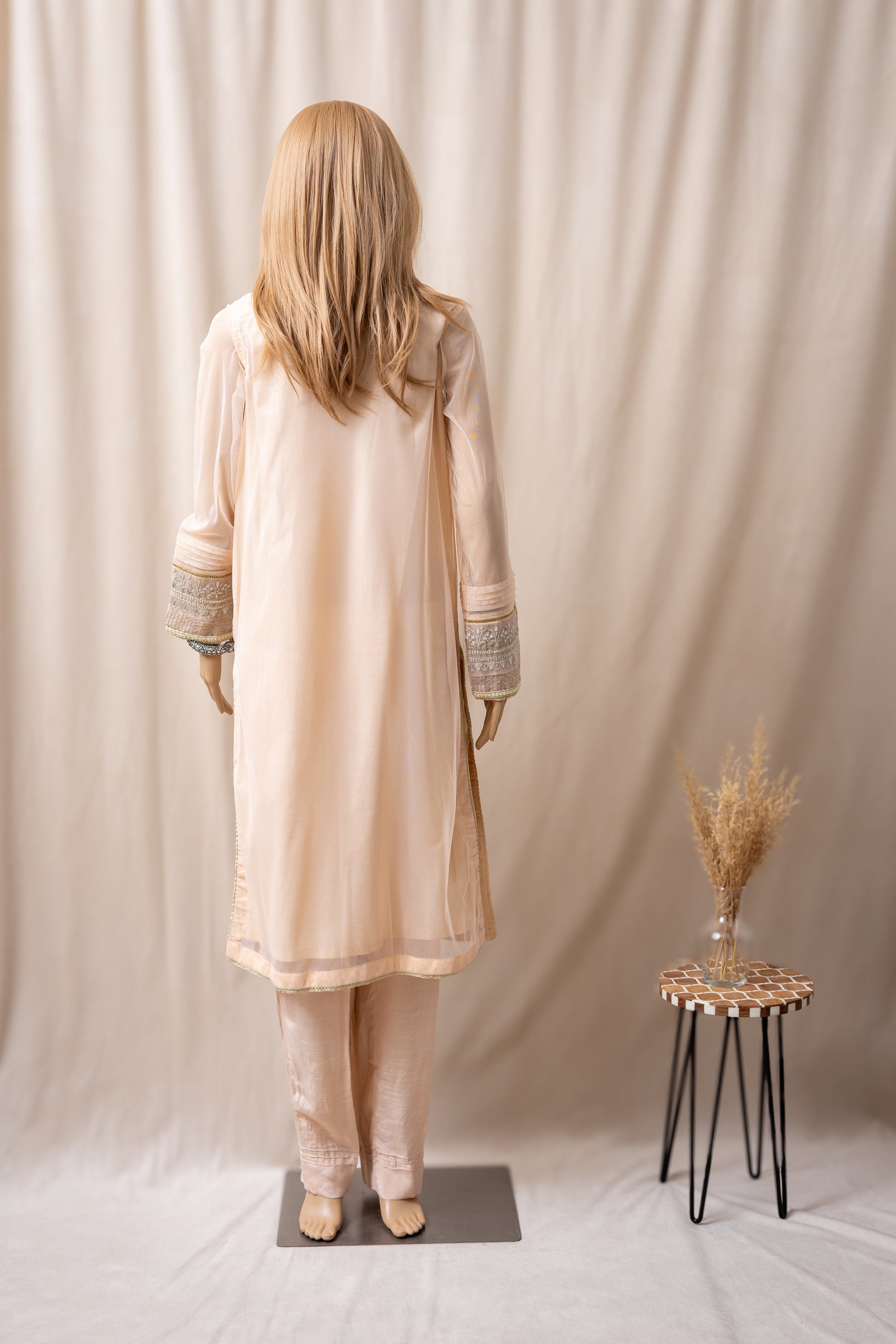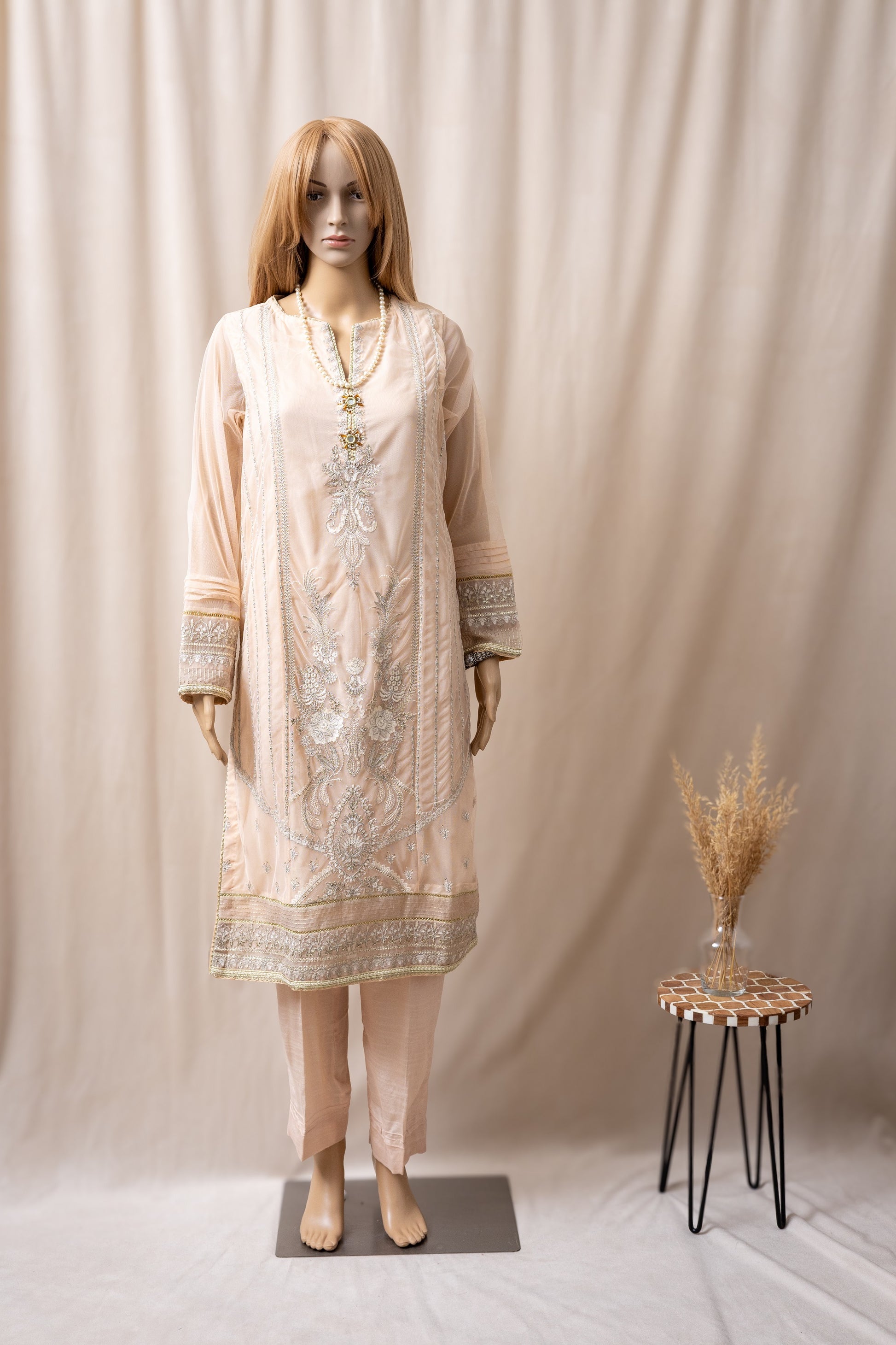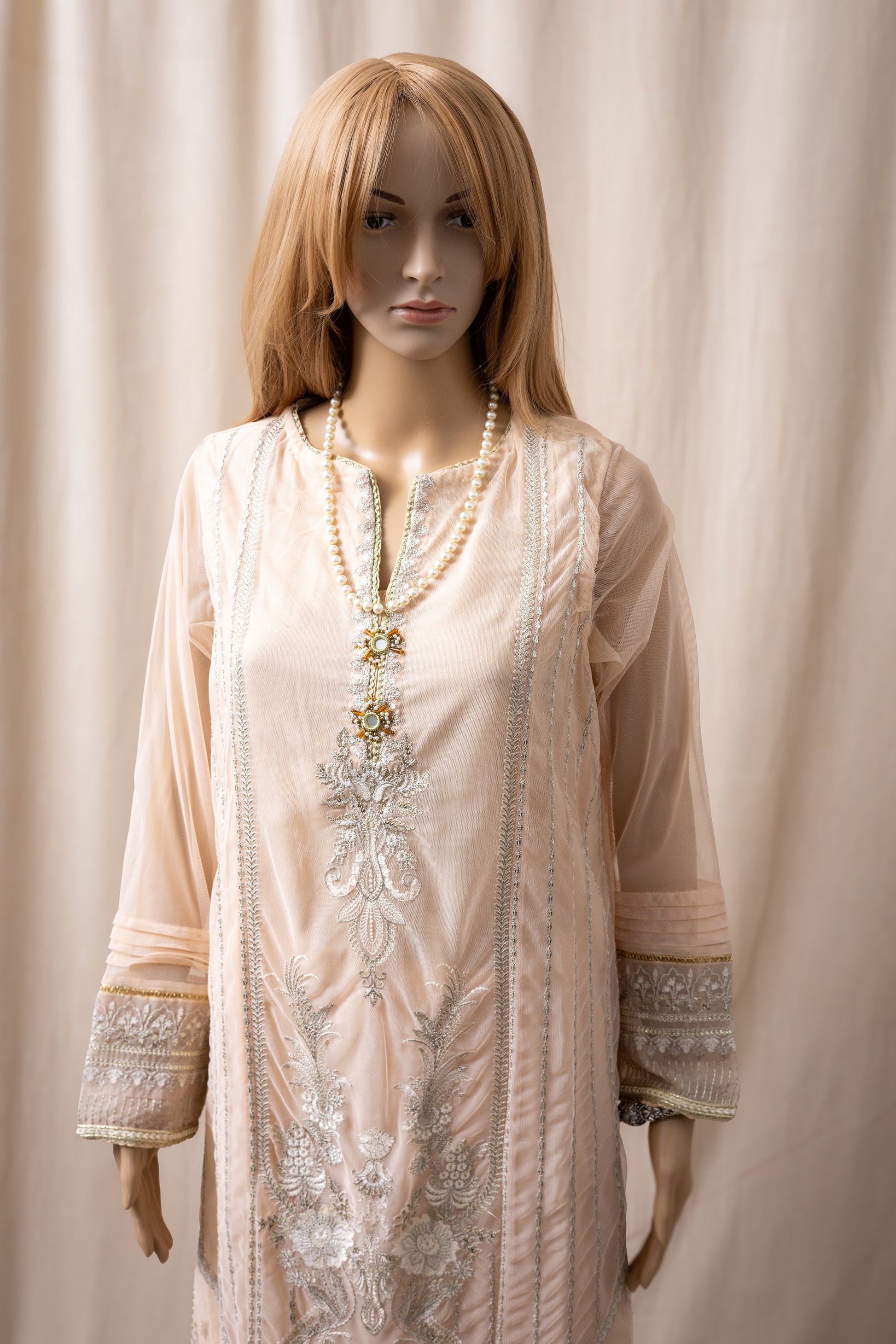 Peach embroidered net 3 piece suit with organza dupatta and raw silk trouser.