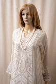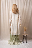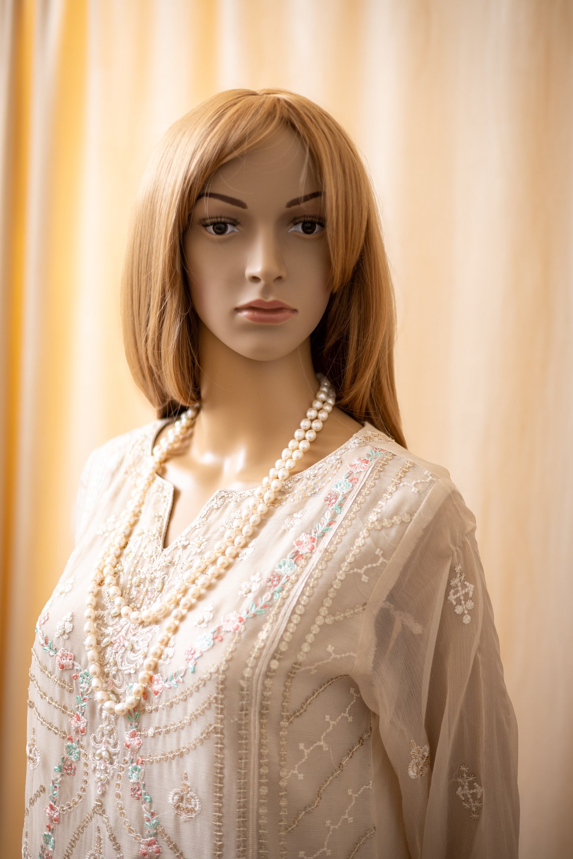 Beige embroidered staight shirt with pearl embellishment. Embroidered chiffon dupatta with straight pants.